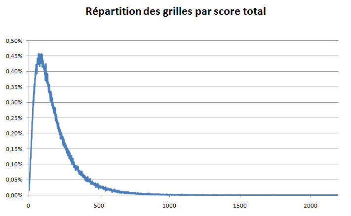 A l’aide du solver de ce site et d’un générateur de grilles aléatoires, voici quelques statistiques (établies sur 300.000 parties differentes) concernant ce jeu :