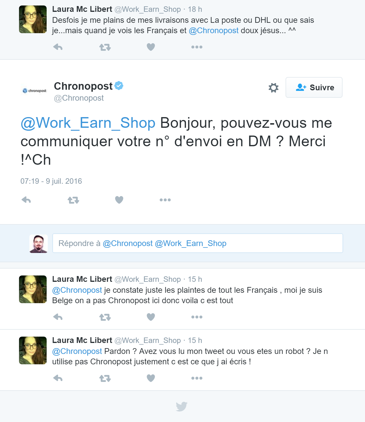 UPDATE : Chronopost a un compte Twitter dont la lecture est édifiante. Cependant, soit c’est un robot qui répond, soit c’est un débile mental. Exemples :