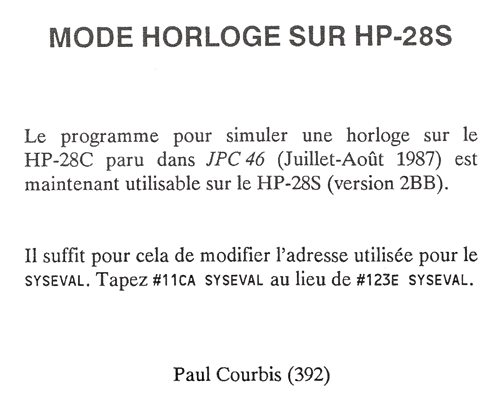 « Mode horloge sur HP28s », JPC, n° 53, Avril 1988, p.6.