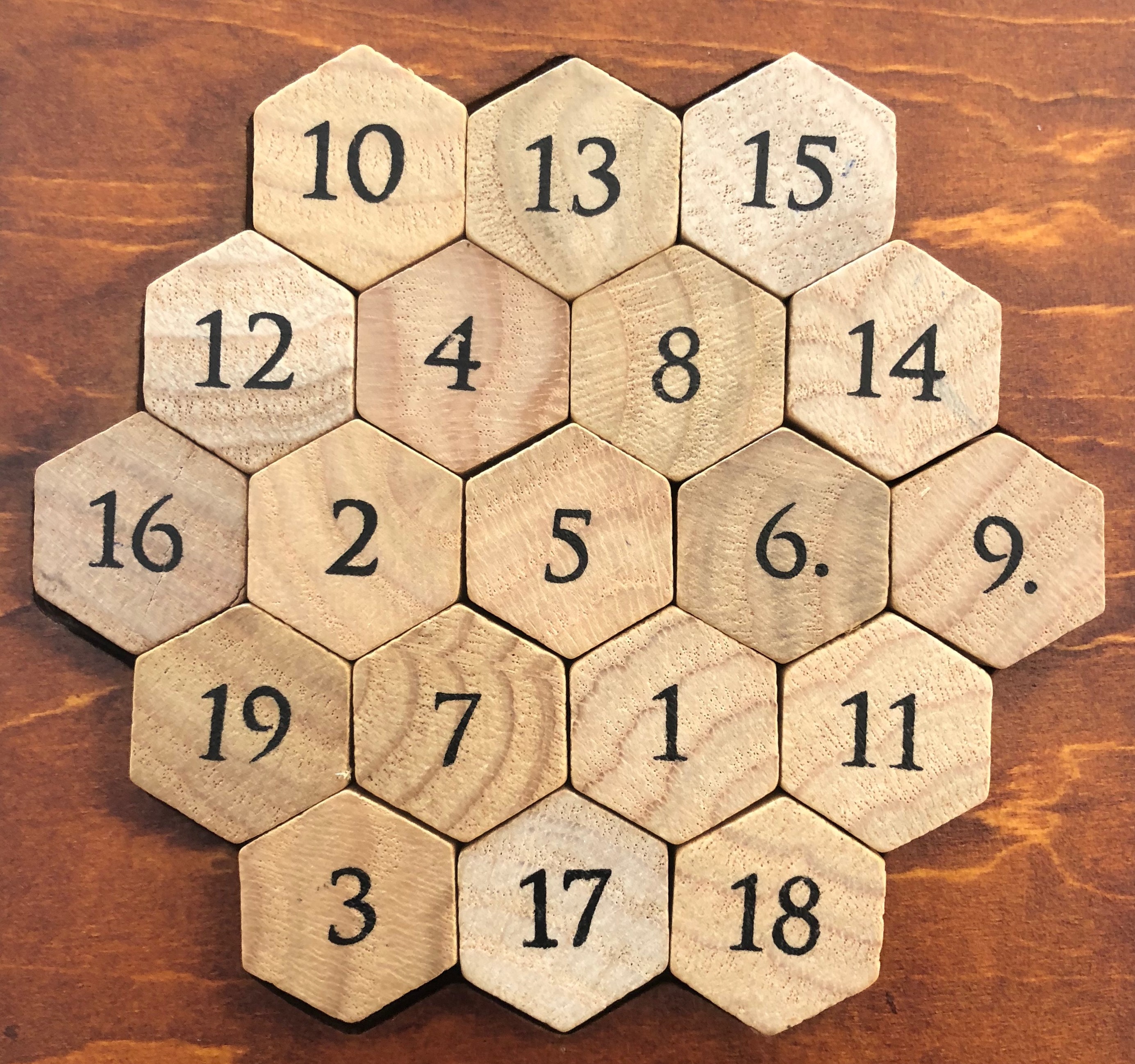 Le puzzle des nombres d’Aristote est un hexagone de côté 3 composé de 19 pièces hexagonales numérotées de 1 à 19 qui doivent être placées de telle manière que la somme des nombre composant une ligne soit toujours égale à 38.