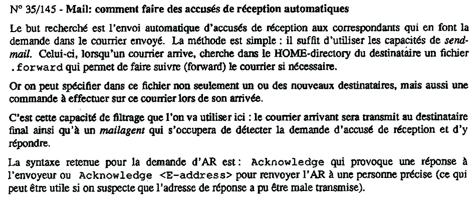 « Mail : comment faire des accusés de réception automatiques », Tribunix, Volume 6, n° 35, Novembre-Décembre 1990, pp. 57-58.